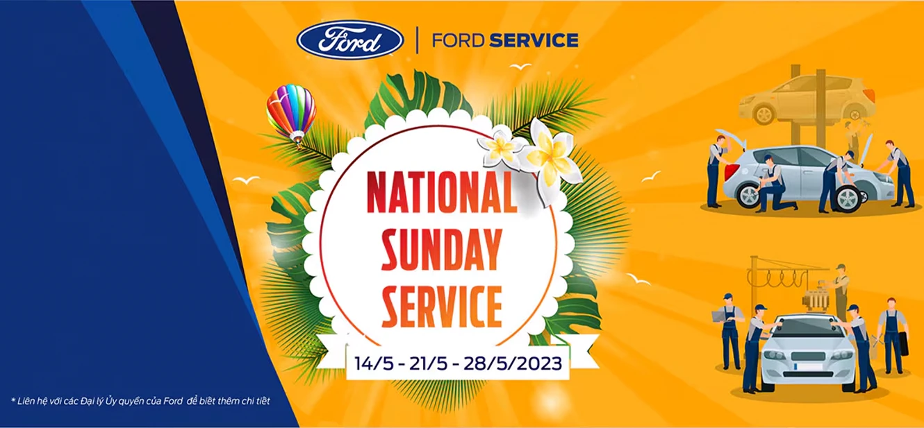 Hiểu được điều này, Ford Việt Nam xin giới thiệu chương trình National Sunday Service - Ngày Chủ Nhật dịch vụ toàn quốc để tạo thuận lợi cho các bạn tới chăm sóc chiếc xe yêu quý của mình. Chương trình sẽ diễn ra vào 3 ngày Chủ Nhật 14/05 - 21/05 - 28/05/2023 trên toàn bộ Hệ thống Đại lý Ủy quyền của Ford Việt Nam(*)
