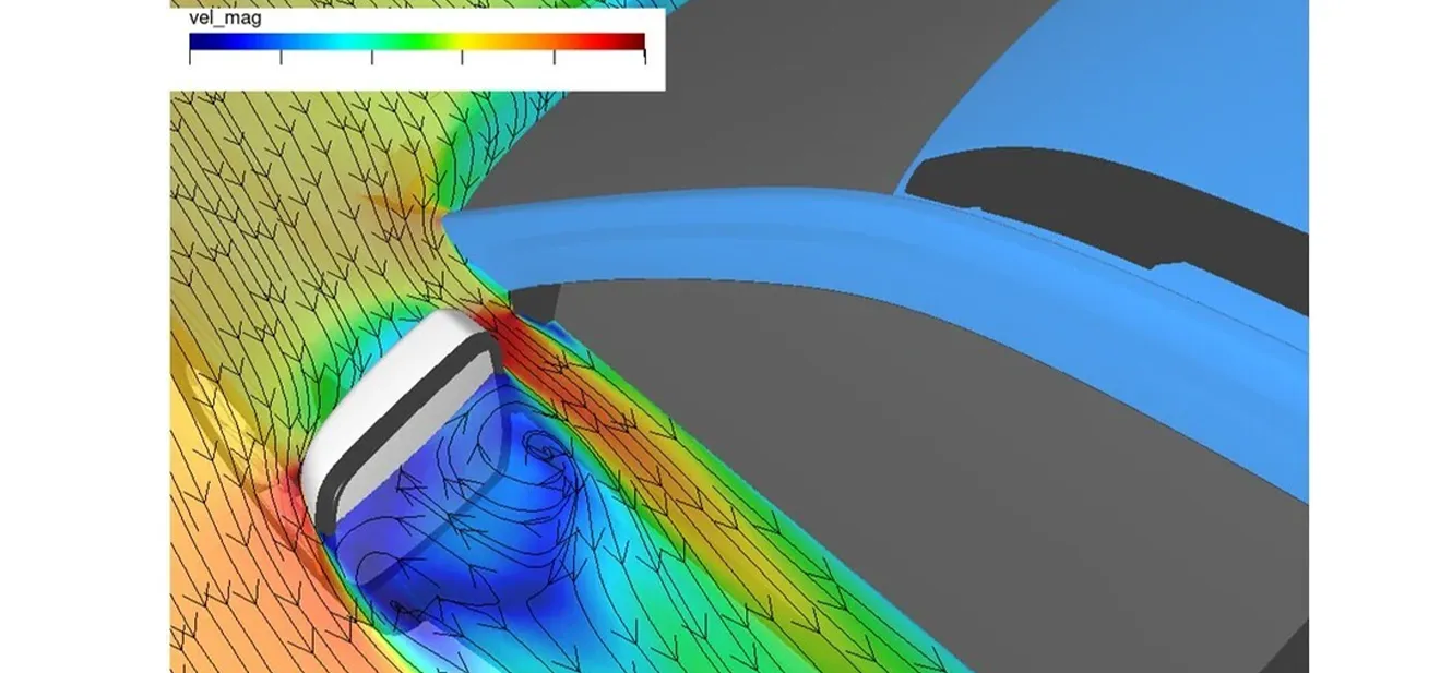 Mặt cắt ngang của luồng không khí xung quanh gương cho thấy hiệu quả ngăn chặn tiếng ồn: Thiết kế của ốp gương và chân gương giúp tạo ra luồng không khí chuyển động nhanh, ngăn tách giữa gương chiếu hậu và kính bên. Từ đó giúp ngăn chặn tiếng ồn gió tạo ra ở gương chiếu hậu lọt vào khoang xe. (Chú thích: Màu Đỏ = Không khí di chuyển với tốc độ Nhanh; Xanh = Không khí di chuyển với tốc độ Chậm)